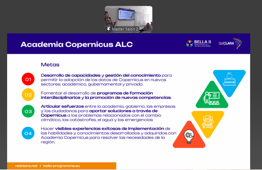 Within this framework, the Copernicus Academy, led by RedCLARA under the BELLA II project, was presented. It promotes training and strategic use of Earth observation data in Latin America and the Caribbean, fostering collaboration among universities, research centers, companies, and governments. “The Copernicus Academy demonstrates how regional coordination can transform data into useful knowledge and concrete actions. RedCLARA plays a key role in facilitating this collaboration and strengthening capacities,” highlighted Mónica Sánchez, Coordinator of Academic Development and Partnerships, who led the session.