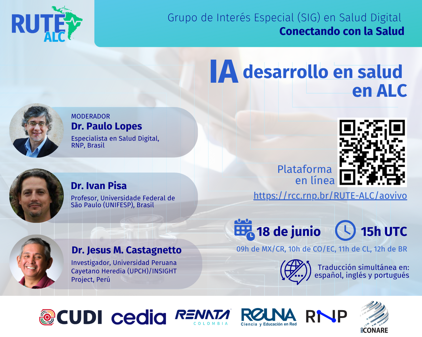 Los panelistas serán Ivan Pisa, profesor de la Universidad Federal de São Paulo (UNIFESP), Brasil y Jesus Martin Castagnetto Mizuaray, investigador de la Universidad Peruana Cayetano Heredia (UPCH) / Proyecto INSIGHT. La moderación estará a cargo del Dr. Paulo Lopes, especialista en Salud Digital de la RNP, Brasil.