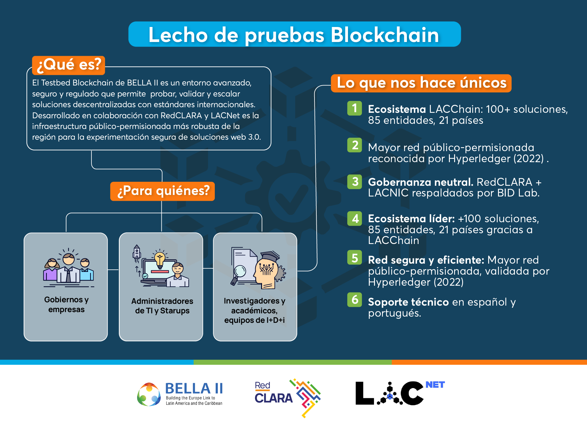 Gracias al proyecto BELLA II, liderado por RedCLARA y cofinanciado por la Unión Europea, la región cuenta con acceso a un entorno innovador, seguro y colaborativo que impulsa el desarrollo y la expansión de esta tecnología: el Testbed Blockchain, o lecho de pruebas blockchain.
