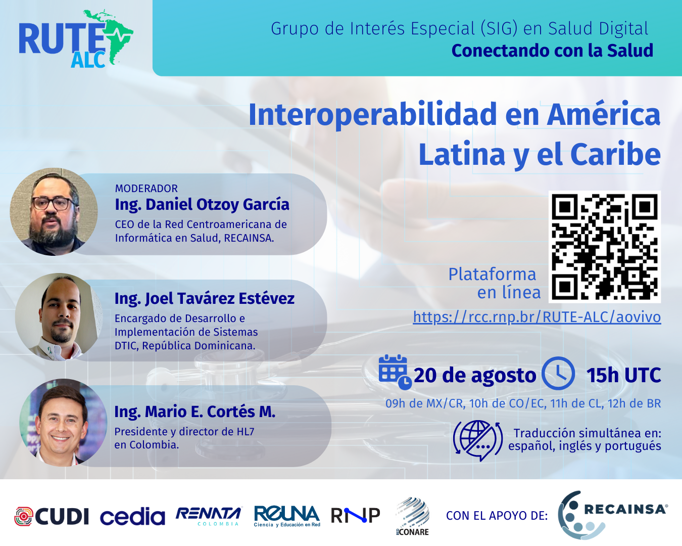 A sessão será moderada pelo Eng. Daniel Otzoy, Diretor Executivo da RECAINSA, e contará com a participação de especialistas como Joel Tavárez, do Ministério da Saúde Pública da República Dominicana, e Mario E. Cortés, presidente da HL7 Colômbia, que compartilharão experiências e boas práticas em projetos de interoperabilidade.