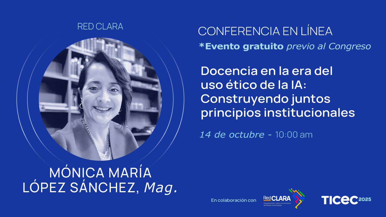 En el marco de las actividades previas al Congreso TICEC 2025, la conferencia insignia de Ecuador en Tecnologías de la Información y Comunicación, RedCLARA, participará en el Workshop “Docencia en la era del uso ético de la IA: construyendo principios institucionales para el futuro educativo”, con la ponencia a cargo de Mónica López, Coordinadora de Desarrollo Académico y Alianzas.